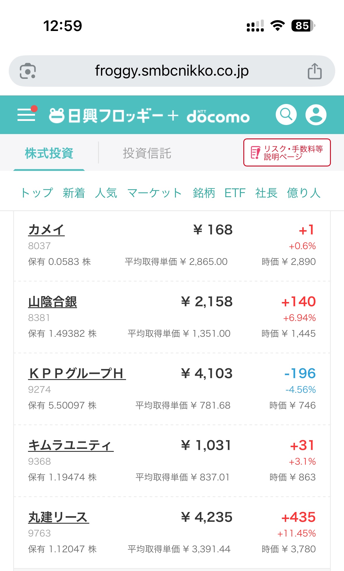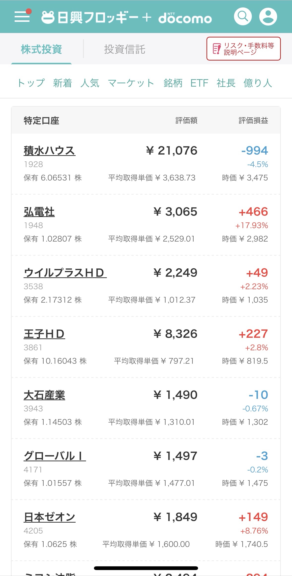 あと、10月ごろより『えすふぁみ投資』youtubeを参考に、日興フロッギーで気になる銘柄をちょこちょこ購入しています。