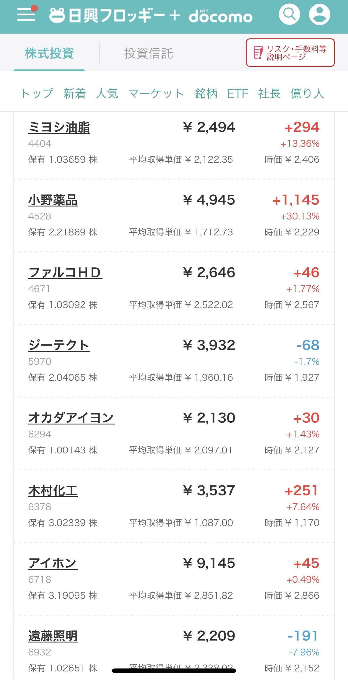 2株しか持ってないのに小野薬品とか+1000円とかおいしいですね。