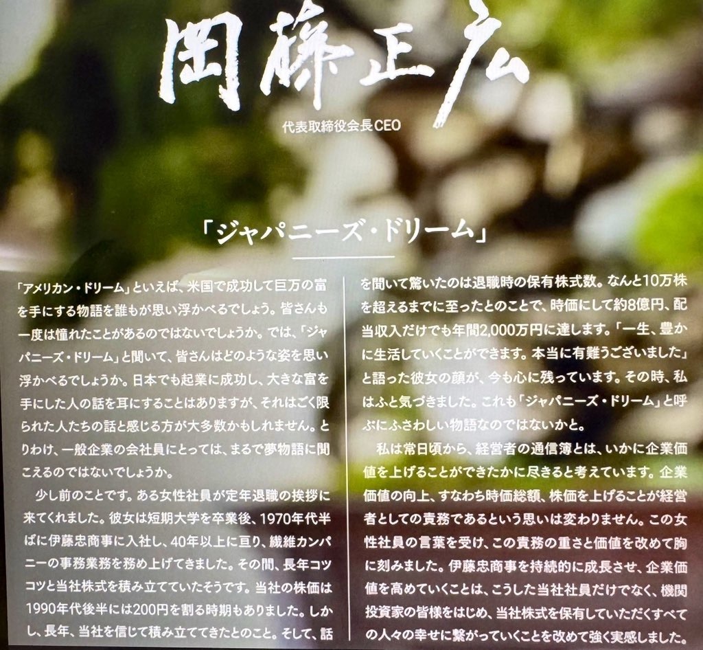 その中の株主通信で、岡藤正広代表取締役会長CEOの「ジャパニーズ・ドリーム」という言葉に出会いました。