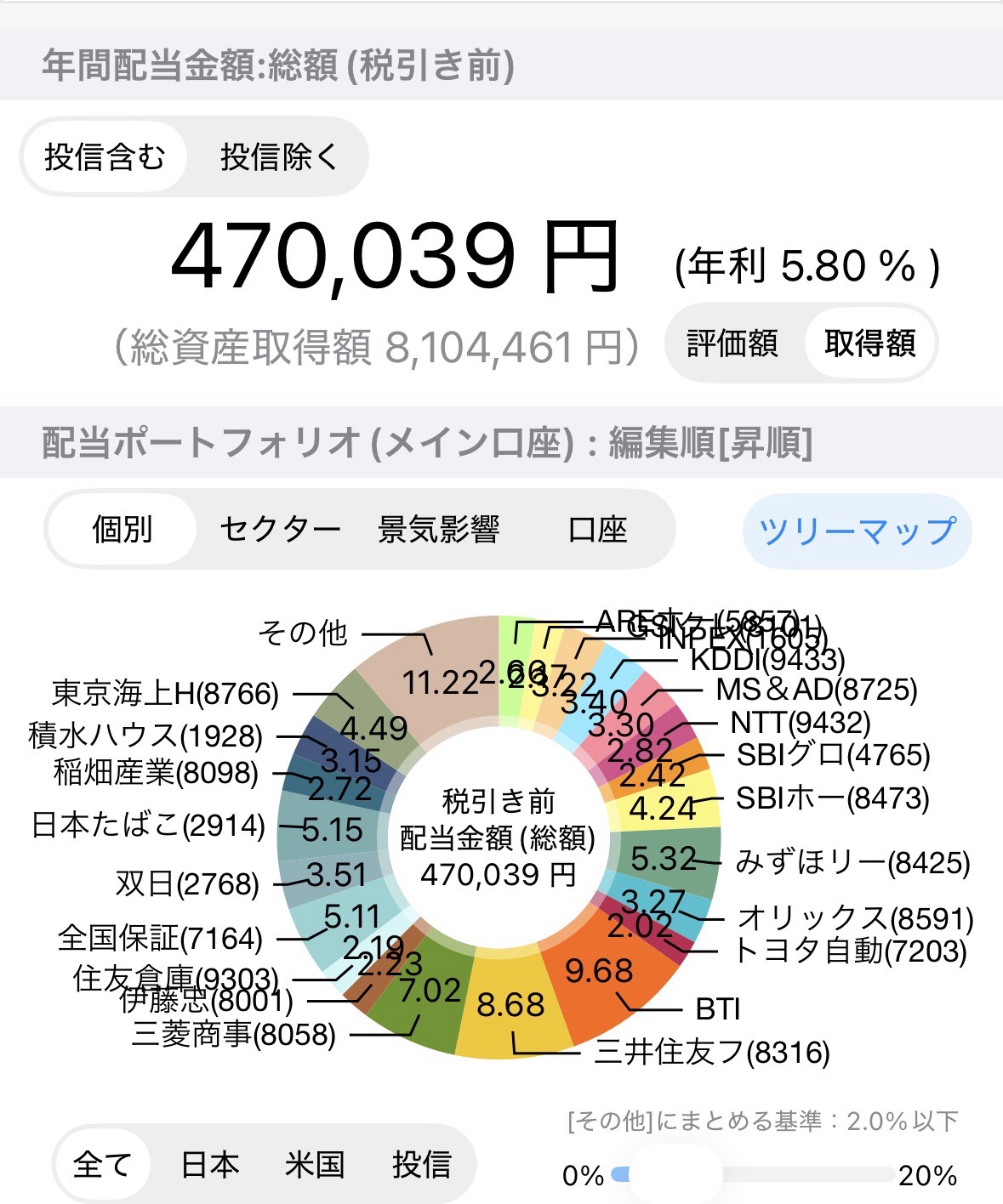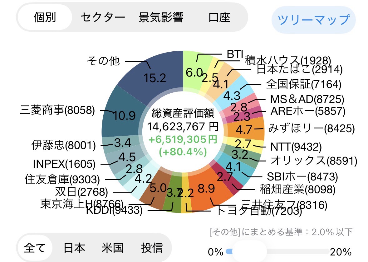 NTT / /KDDI /三菱商事  /オリックス /稲畑産業 /キリン /JT  /三菱UFJ /みずほリース/GSIクレオス /SBIグローバルアセット /ENEOS / 積水ハウス /アサヒHD /住友倉庫  /伊藤忠商事…250株 / クミアイ化学工業 /MS&AD…75株